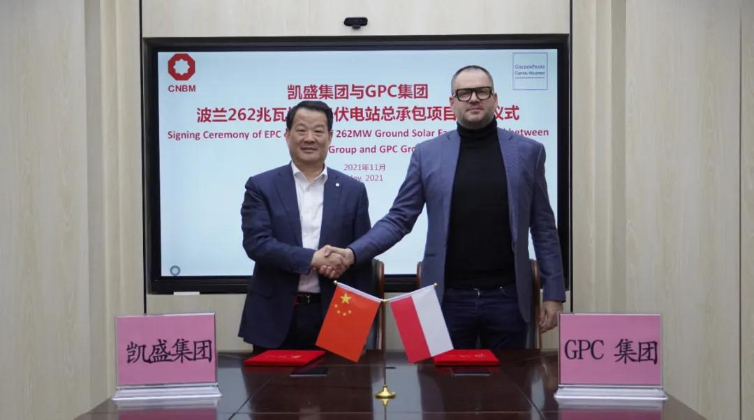 ? 中國(guó)工程院院士、中國(guó)建材集團(tuán)總工程師、凱盛科技集團(tuán)董事長(zhǎng)彭壽與GPC集團(tuán)主席Daniel Tain代表雙方簽訂波蘭262MW地面光伏電站項(xiàng)目總承包合同。