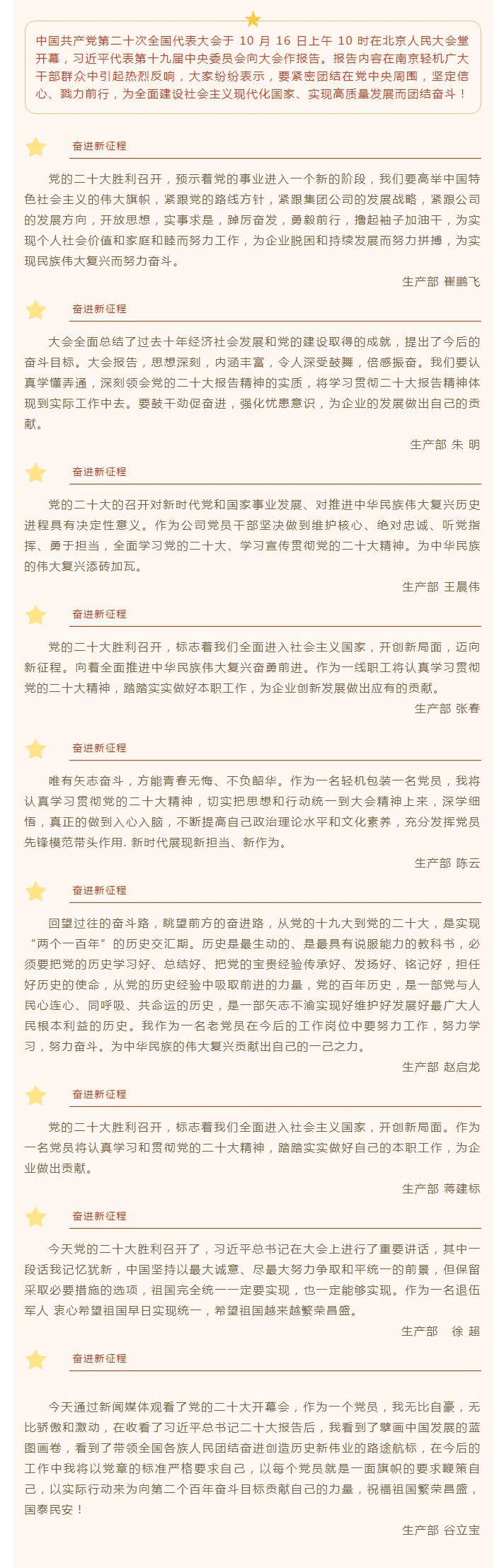 二十大的召開(kāi),標(biāo)志著我們?nèi)孢M(jìn)入社會(huì)主義國(guó)家新征程,我們要始終高揚(yáng)新時(shí)代中國(guó)特色社會(huì)主義偉大旗幟,堅(jiān)定不移貫徹落實(shí)黨的二十大精神和集團(tuán)公司決策部署。扛起政治責(zé)任,不忘初心,牢記使命,努力以時(shí)不我待、只爭(zhēng)朝夕的精神,將學(xué)習(xí)貫徹二十大精神落實(shí)到創(chuàng)新進(jìn)取的工作實(shí)踐之中。強(qiáng)化責(zé)任,砥礪奮進(jìn),為公司創(chuàng)新發(fā)展、加快轉(zhuǎn)型付出最大努力,為南輕二次創(chuàng)業(yè)做出自己應(yīng)有的貢獻(xiàn)!生產(chǎn)部副部長(zhǎng) 齊正榮