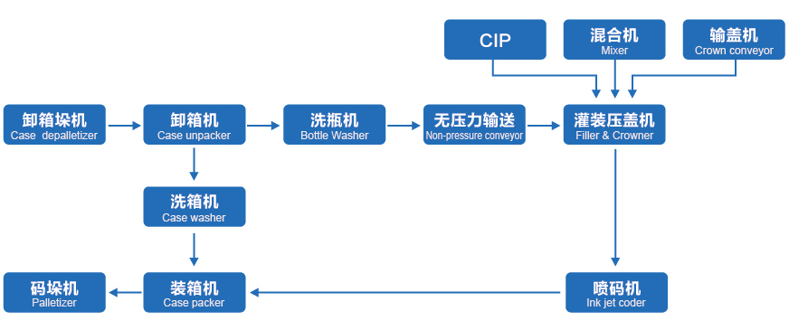3、生產(chǎn)線主要設(shè)備組成:卸垛機(jī)、卸箱機(jī)、洗瓶機(jī)、灌裝機(jī)、混合機(jī)、裝箱機(jī)、碼垛機(jī)、瓶箱輸送機(jī)等;