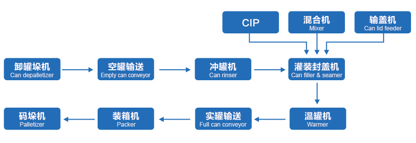 3、生產(chǎn)線主要設(shè)備組成:卸垛機(jī)、沖罐機(jī)、灌裝封蓋機(jī)、殺菌機(jī)、紙箱包裝機(jī)(膜包機(jī))、碼垛機(jī)、罐箱輸送機(jī)等;